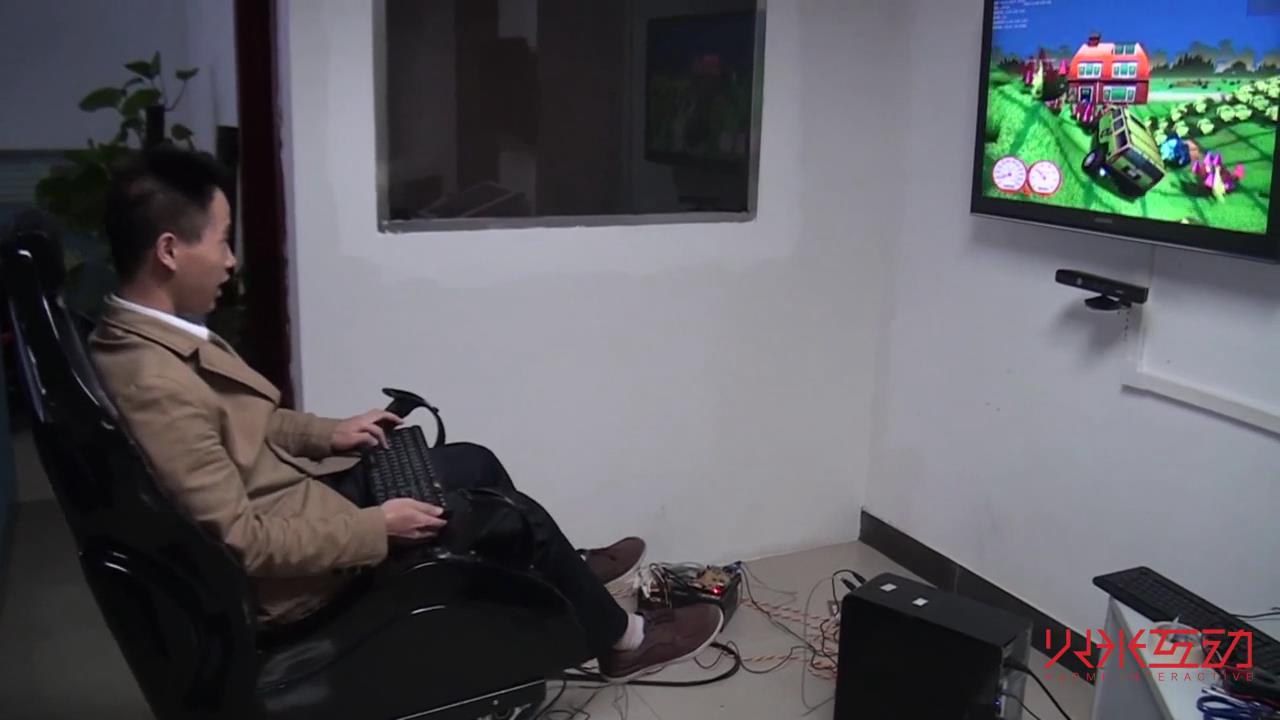 視頻中展示的是4D影院中的動感座椅,根據游戲的故事情節,由計算機控制做出特技效果,可以帶來震動、顛簸等特效。從而調動了認得感知系統,使參與者仿佛真的參加了這個游戲,非常驚險刺激,帶來身臨其境的體驗感。