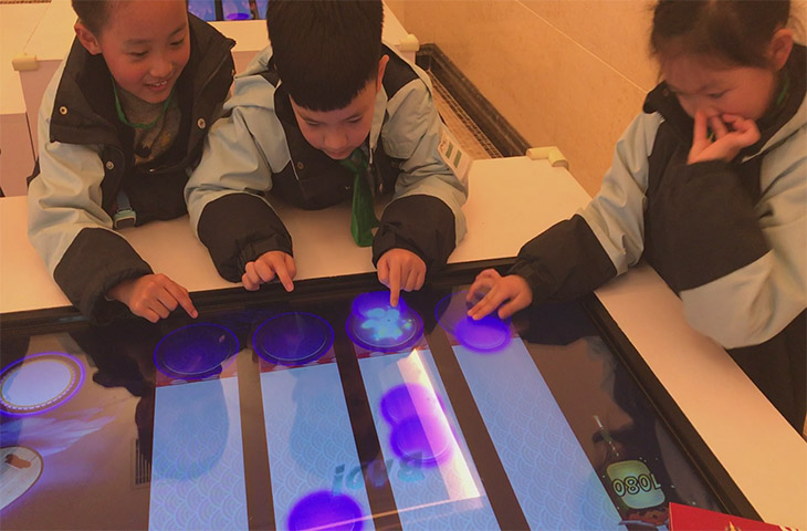 桌面互動,多媒體行業稱為桌面投影,又稱為“互動桌面”,系統由互動軟件及感應設備組成,通過投影機投射到桌面,人與感應設備觸發軟件產生的特定動畫效果。桌面互動有兩種:桌面投影互動、桌面觸摸互動。